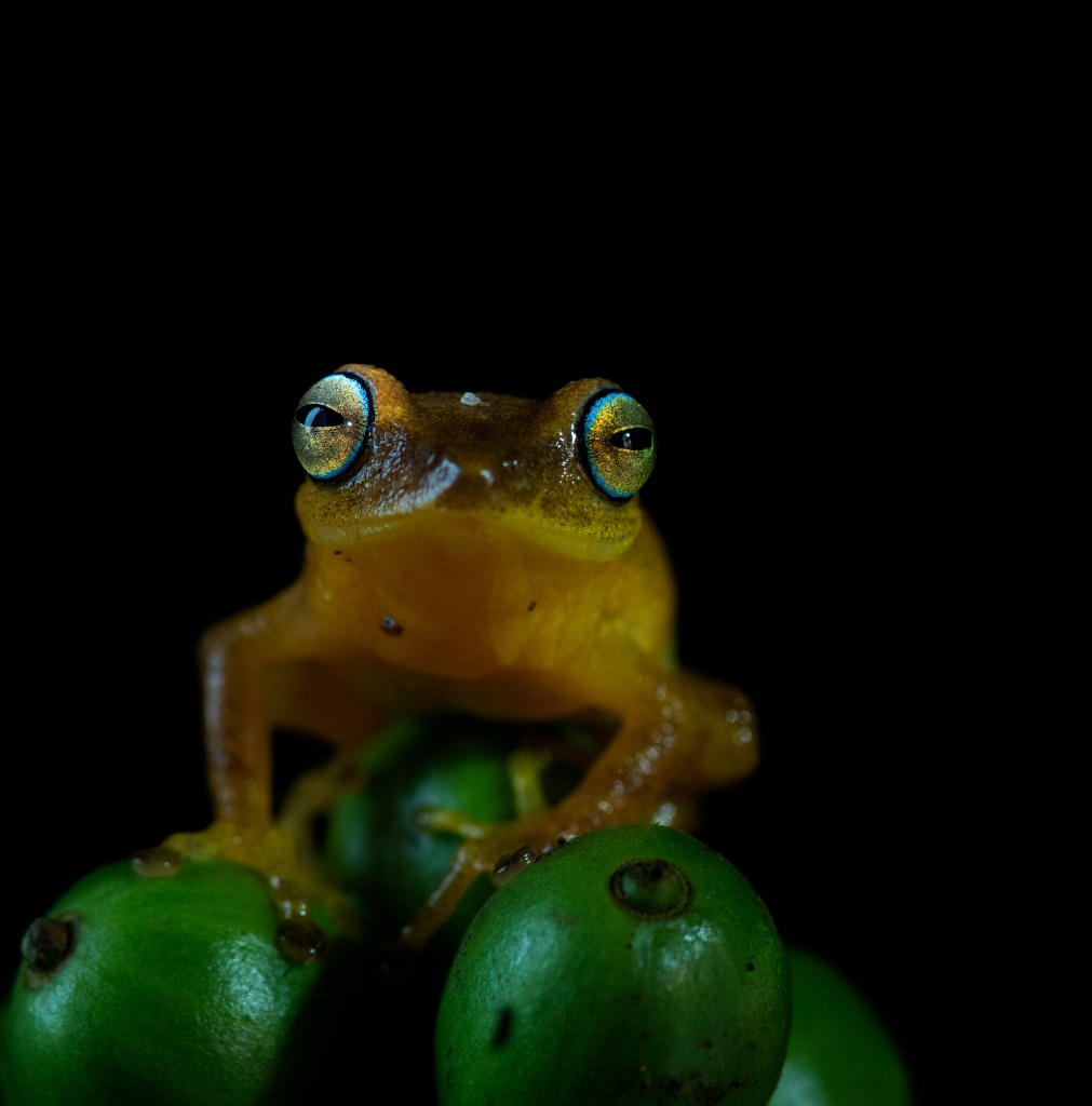 Coorg yellow bush frogs are most commonly found in disturbed habitats, near coffee plantations adjacent to primary forests and waysides. They are often found on leaves or stems of shrubs about one metre above the ground. Male frogs start calling at dusk, first under the leaf litter and then ascending to the vegetation. A beautiful blue ring around their pale yellow elliptical eyes gives them a mesmerized look of “the frog prince” from Grimm Brothers’ fairy tales.
