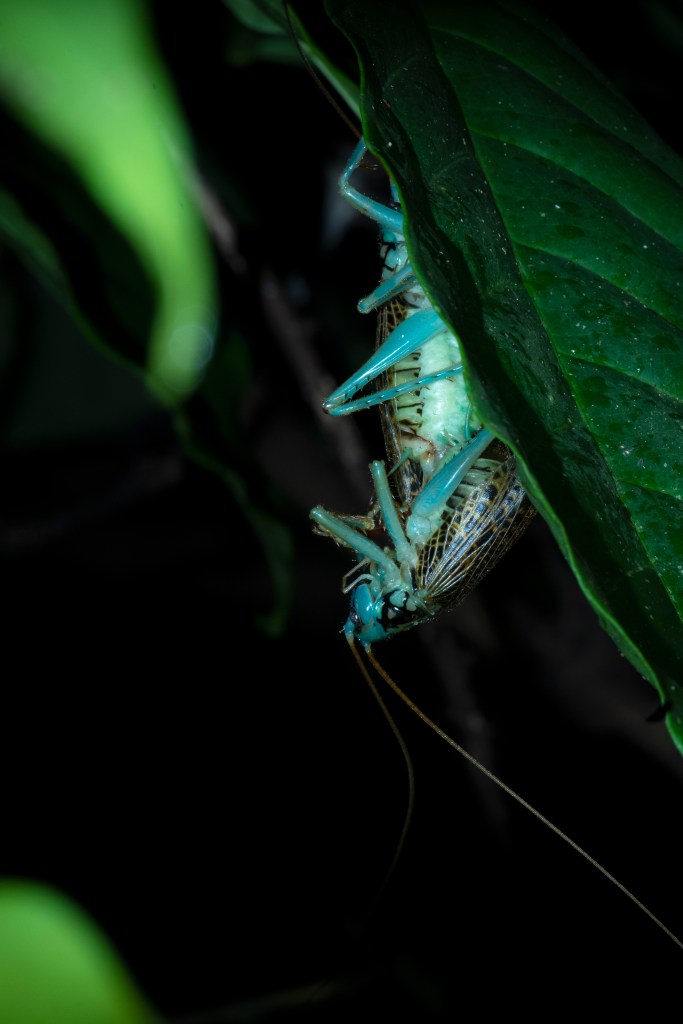 Around 10:30 PM, when we were leaving the forest, Samantha spotted two pairs of fine and long antenna, protruding out from the underneath of a large leaf of Arabica coffee tree. Phillip went close and confirmed a pair of mating cicada. The key vocalist of the daytime consert in the forest of monsoon caressed Western Ghats, was engrossed in the process of bringing new life and spreading love for all the jewles of Mother Nature.