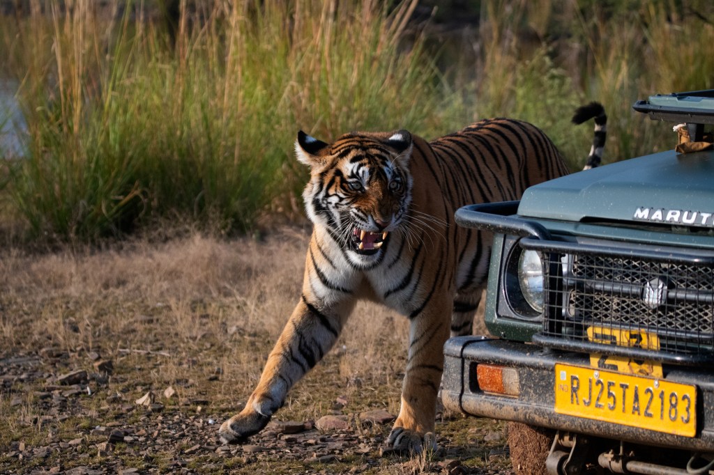 She started getting closer to us. Expert guide Hansraj with help of driver Mahender parked the gypsy in such a way that we got best possible angle and light to shoot her. She came to a position where she got surrounded by tourist vehicles. That situation particularly annoyed her and she snarled at one near by gypsy, with full display of her magnificent fang.
