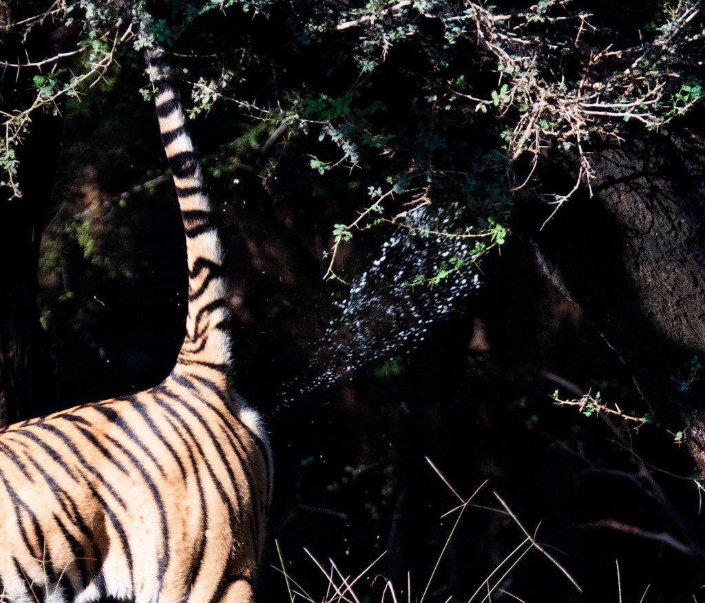 That was how we could capture an important behaviour of tiger which is key for their survival as far as natural history in concern. That behaviour was scent marking. Tigers inform each other of their whereabouts through complex scent markings that contain pheromones. Scientific studies say that marking is most intensive when tigers were establishing territories, and animals on adjacent territories appeared to mark in response to each other. Females marks intensively just prior to oestrus; this behaviour gets reduced during oestrus. Males marked more frequently when females were in oestrus than during other stages of the females’ cycle.