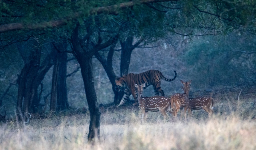 When we were exiting the forest for the day, we heard far away bellowing of spotted deers’ alarm call. We saw through the haze formed by last light of the day, that T120 passed by a herd of spotted deer, without even paying much attention to them. While the panic-stricken deer were looking at his disintegration in the foliage of Central Indian tiger landscape.