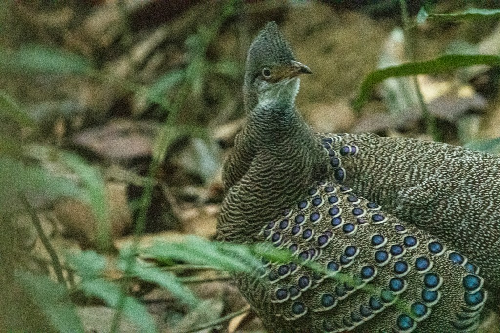 Next day, we started at 6:00 AM and continued till lunch break at 1:30 PM. It was all bush walking, ascending, and descending through dense foliage of Dehing Patkai rainforest. Within an hour of our morning exploration, we got to see a male grey peacock pheasant. When we were busy in shooting that bird from quite proximity, our driver Guru sent an SOS of elephant alert through walkie-talkie to Palash. He saw a male elephant standing behind our car which was parked on the forest path and upon noticing Guru it entered deep forest, where we were busy with peacock-pheasant. Therefore, another run for the life for us and that was bit difficult and far scarier than the previous one. That time the sighting of elephant was real and forest path was more hostile because of thorny bush, thick foliage, and muddy path.